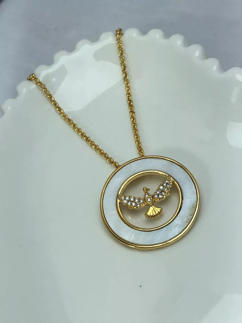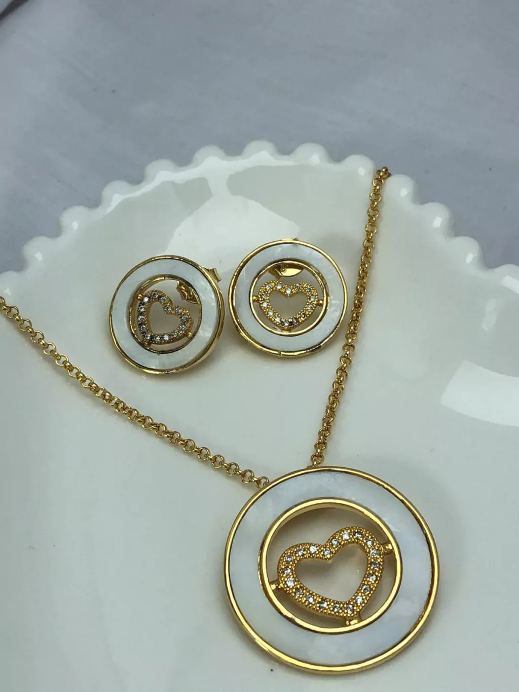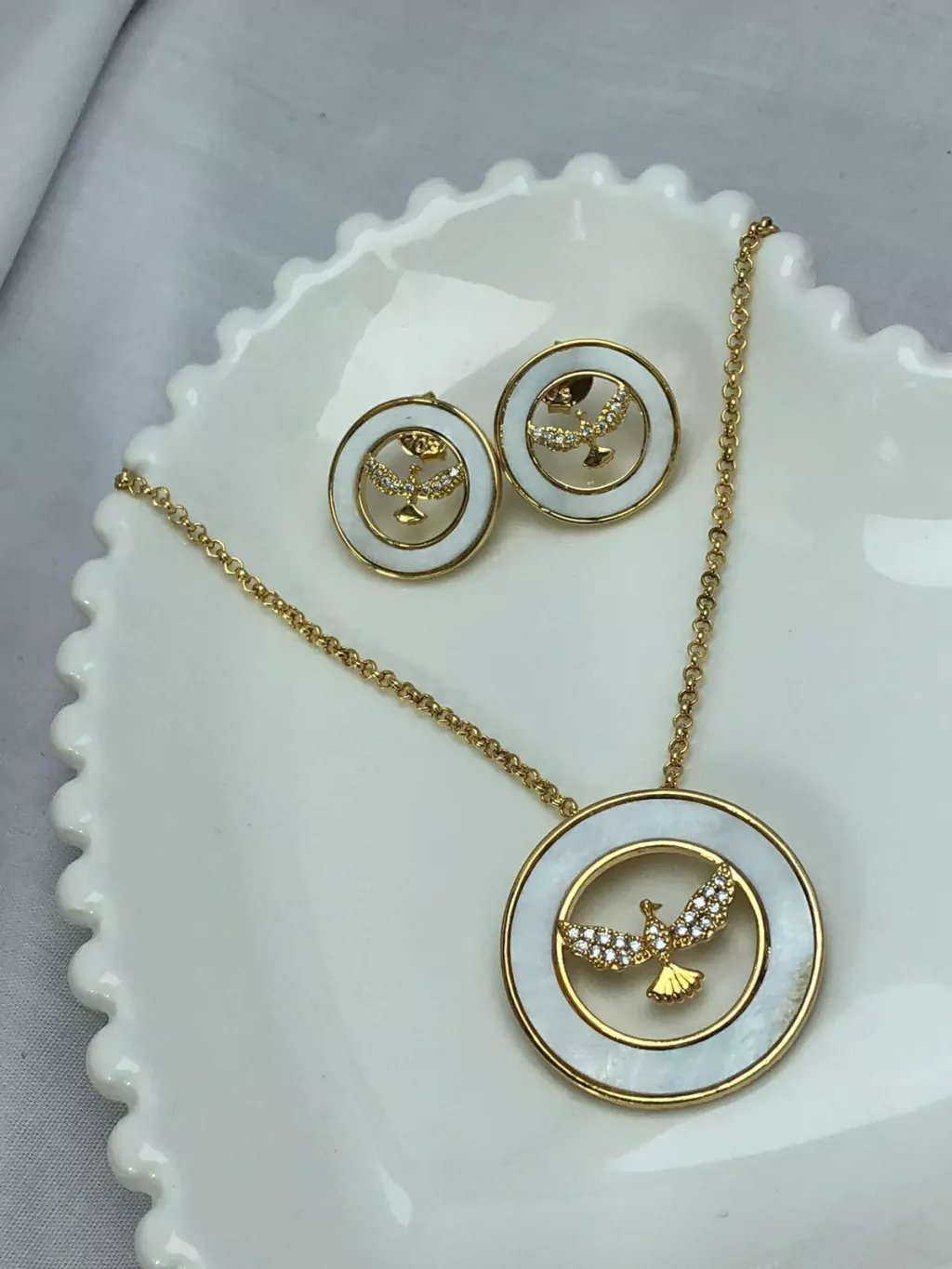 Deslumbre-se com a serena beleza do Conjunto Perolado Pomba da Paz Cravejado. Este conjunto irradia uma aura de paz e elegância, com seu design encantador apresentando uma pomba cravejada de brilhantes sobre um fundo de material perolado. Cada detalhe desta peça é uma celebração da delicadeza e do refinamento, proporcionando um brilho suave e atemporal que complementa qualquer ocasião. Seja para uma cerimônia especial ou para enriquecer seu estilo cotidiano com um toque de significado simbólico, este conjunto é uma escolha sublime que transmite harmonia e graça em cada momento.